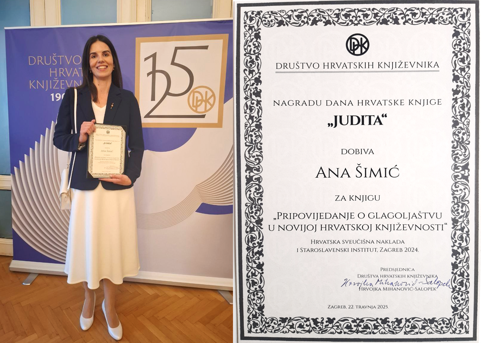 Ove je godine, 22. travnja u Zagrebu, u sklopu obilježavanja Dana hrvatske knjige i 125. obljetnice postojanja Društva hrvatskih književnika nagrada »Judita« dodijeljena dr. sc. Ani Šimić, znanstvenoj savjetnici u Odjelu za Rječnik crkvenoslavenskoga jezika hrvatske redakcije Staroslavenskoga instituta, za knjigu Pripovijedanje o glagoljaštvu u novijoj hrvatskoj književnosti (2024.). Njezini su izdavači Hrvatska sveučilišna naklada i Staroslavenski institut.