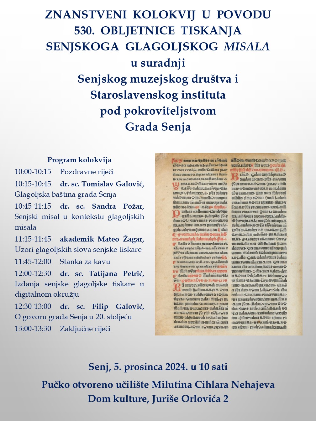 Ove se godine obilježava 530. obljetnica Misala. Tim povodom Senjsko muzejsko društvo i Staroslavenski institut pod pokroviteljstvom Grada Senja organiziraju znanstveni kolokvij koji će se održati u četvrtak 5. prosinca 2024. s početkom u 10 sati u Pučkome otvorenom učilištu Milutina Cihlara Nehajeva u Senju.