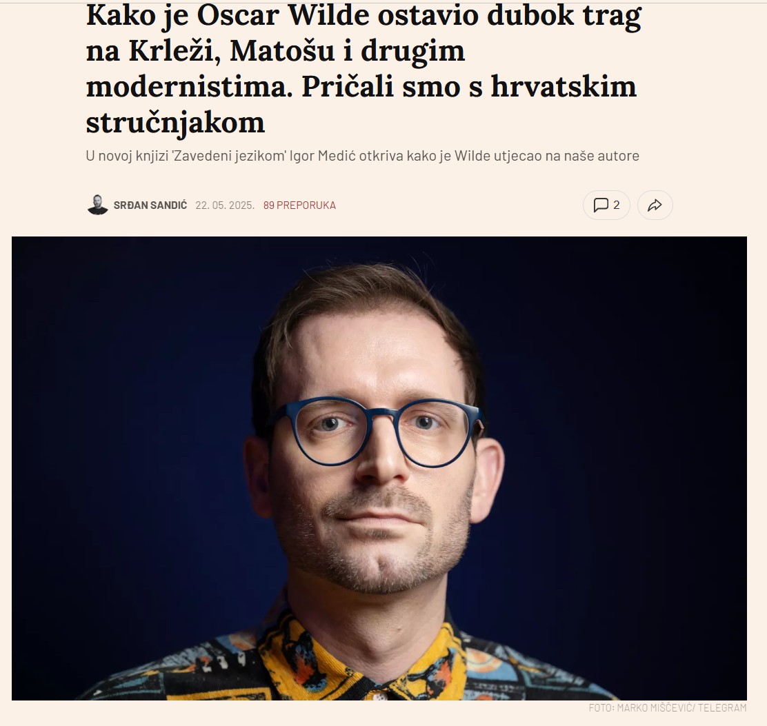 Medić, I. Zavedeni jezikom – Oscar Wilde i hrvatski književni modernisti, Zagreb: Durieux. 2024. (ISBN 978-953-188-554-6)